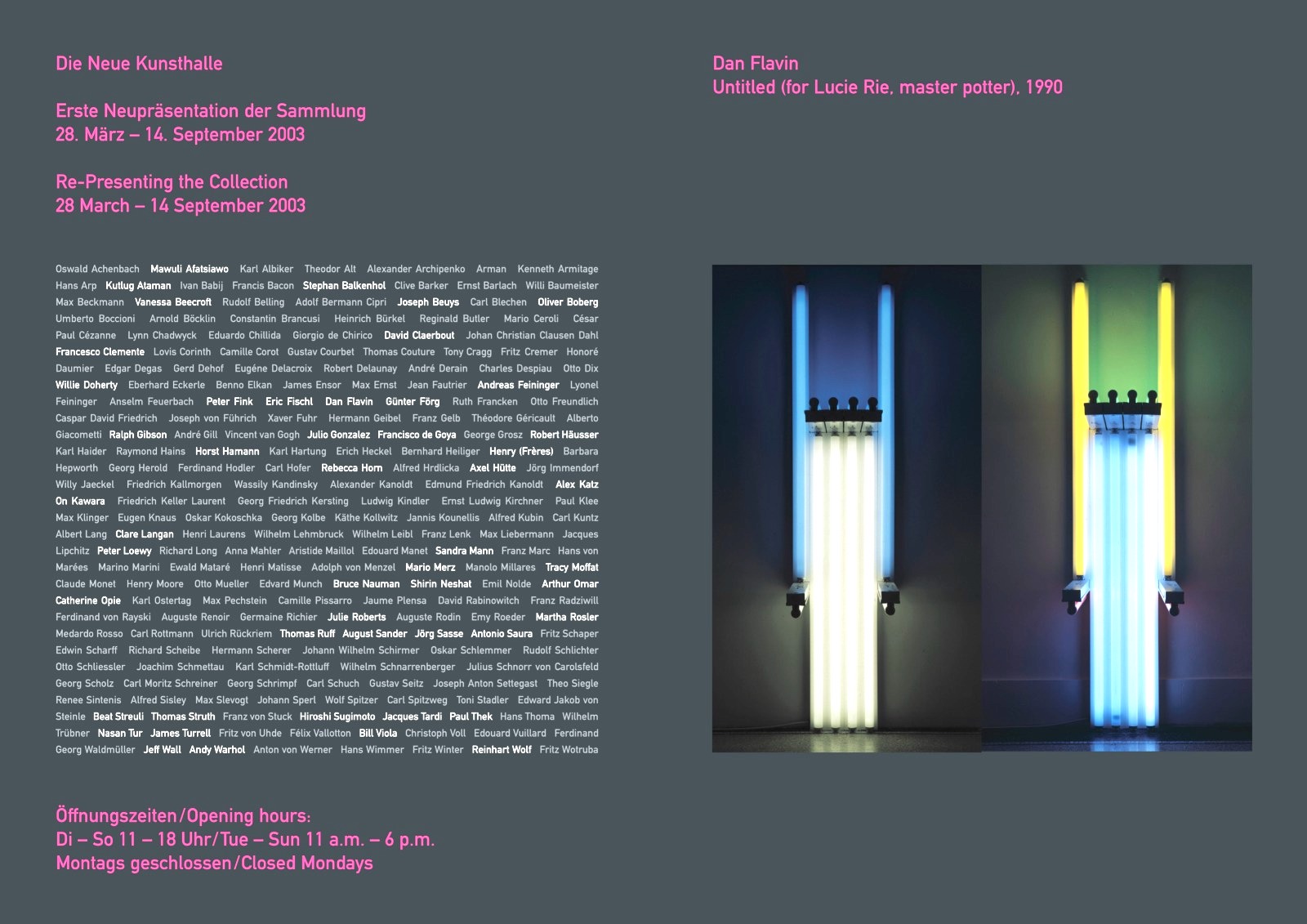 Beginn des vierteiligen Ausstellungszyklus: «Die Neue Kunsthalle I: Erste Neupräsentation der Sammlung», Kunsthalle Mannheim 2003. Beginn der Ausstellungsreihe «Dialoge im Bunker 1: Sublime Landschaften», Ausgewählte Werke der Graphischen Sammlung im Dialog mit zeitgenössischer Kunst, Kunsthalle Mannheim 2003.